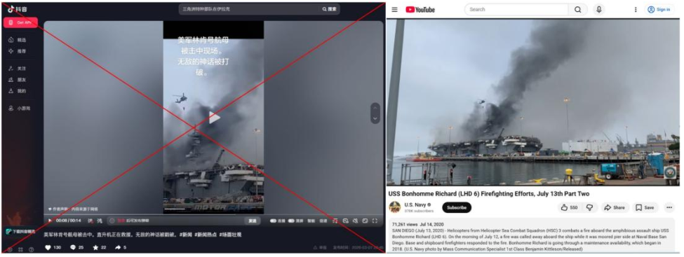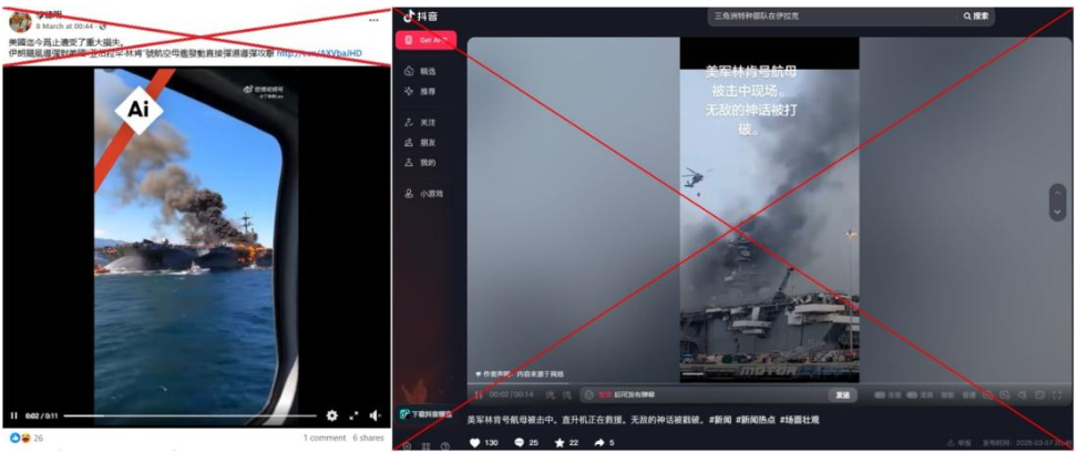 3月8日,脸书上出现了一段大船起火的视频,配文用中文写道:“美国到目前为止已经遭受了重大损失,伊朗导弹直接对‘亚伯拉罕·林肯’号航母发动了弹道袭击。”3月7日,抖音上也发布了另一段军舰起火的视频,内容同样宣称“亚伯拉罕·林肯”号航母遭到了袭击。包含上述两段视频、说法一致的帖子,也以多种语言在全球社交媒体上广泛传播。
