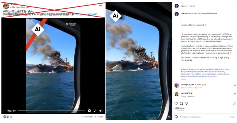此前伊朗方面称,为报复2月下旬美国和以色列的联合袭击,他们用无人机击中了美国一艘航空母舰。美国方面表示,这艘航母根本没有被伊朗无人机击中。近日社交媒体上流传的两段相关视频,声称能证明“亚伯拉罕·林肯”号航母确实受到损坏——然而,其中一段视频是AI生成的假画面,另一段则是2020年美国一艘军舰起火的旧影像。